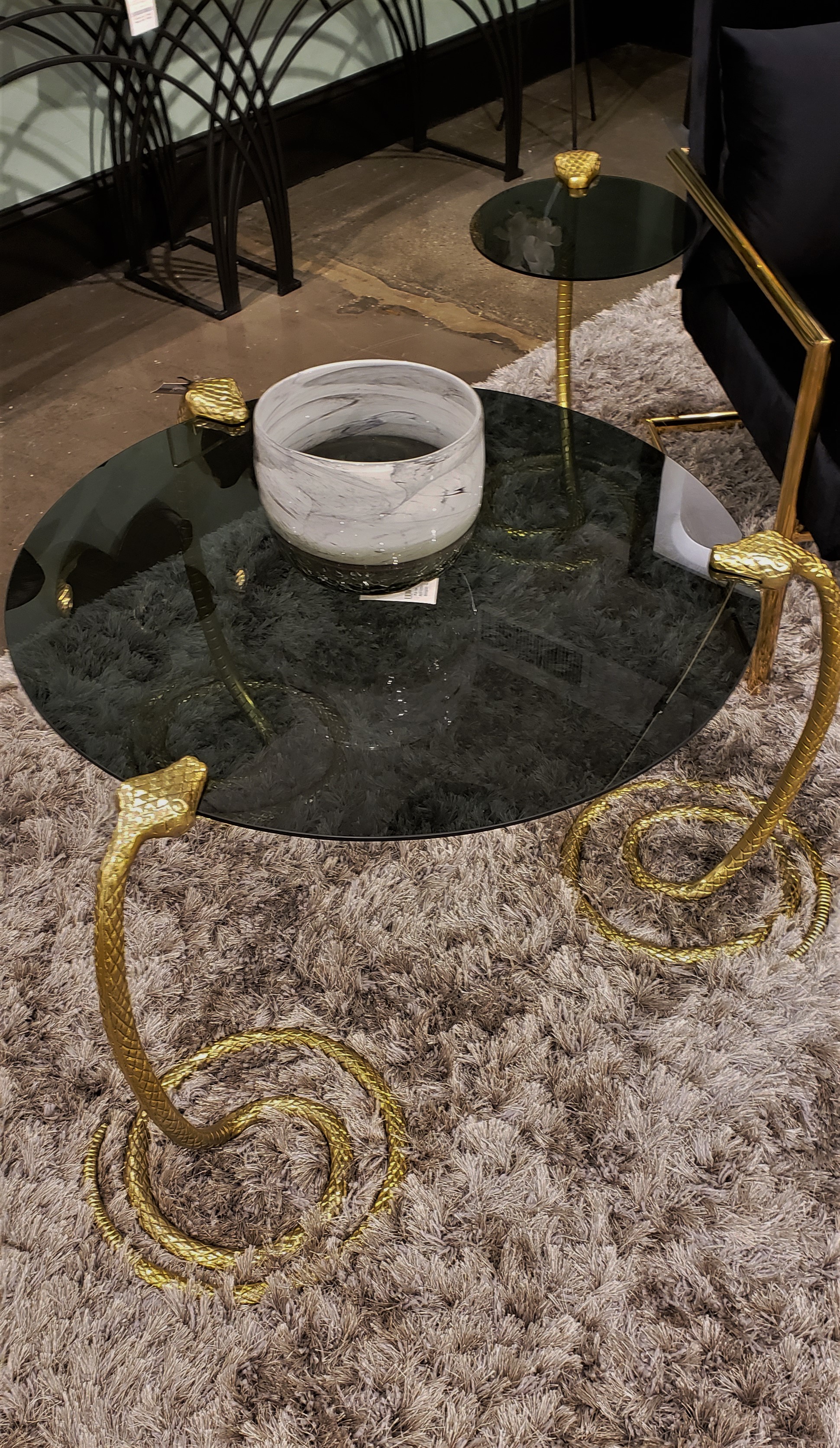 Speaking of animal hide, animal prints and figures are huge! Check out this snake leg coffee table from Sagebrook Home and cowhide accent chair.