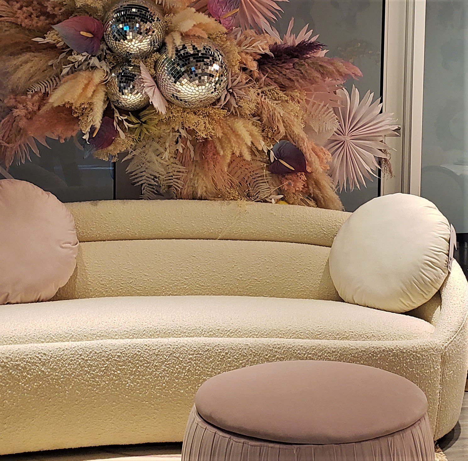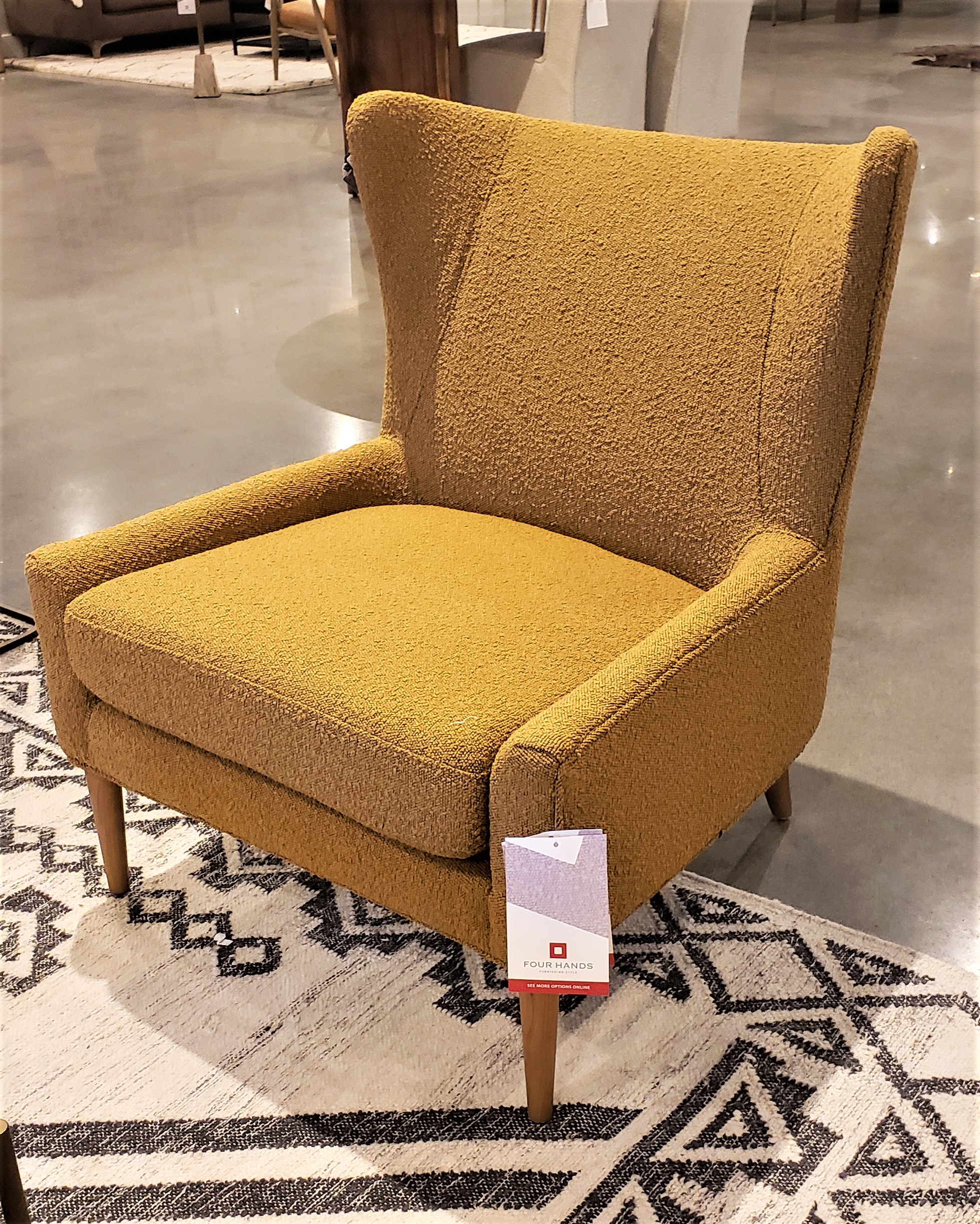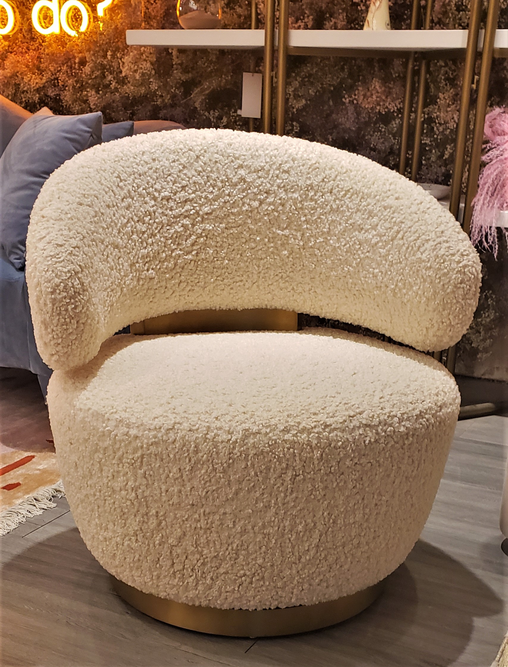Pictured below are accent chairs covered in bouclé. Left is a dyed bouclé chair by Four Hands and Tov chair on the right.